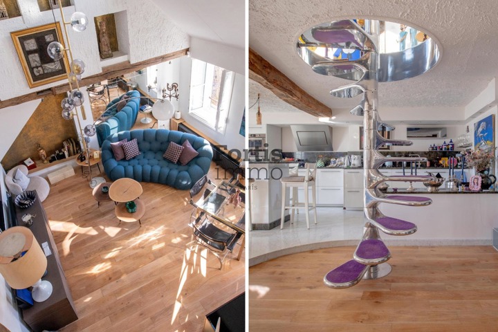 À l’étage, accessible par l’escalier Tallon, une vaste chambre en surplomb du séjour offre une perspective ouverte sur le volume principal. Un second escalier mène à une chambre mansardée disposant de nombreux rangements, ainsi qu’à une salle d’eau, des toilettes, une buanderie et un dressing. Un accés privé au toit vient compléter l’ensemble.
