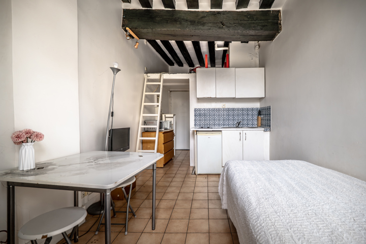 Paris 1er Rue Saint-Denis, proche Rivoli Au 3ème étage d’un immeuble ancien, un studio de 18,33m² au sol, dont 14,68m² carrez, proposant une belle hauteur sous plafond et une vue dégagée. Il est composé d’une entrée, d’une pièce principale avec cuisinette et mezzanine, et une salle de bains avec WC. 2M90 de hauteur sous plafond, vue sur toits et ciel. Idéal en pied à terre ou investissement locatif. Bien soumis au statut de la copropriété. 1 lot/21 Quote-part du budget annuel prévisionnel : 1085 €