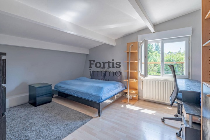 Au premier étage, deux chambres confortables avec parquet ancien, une chambre actuellement transformée en dressing, une grande salle de bains avec WC.
