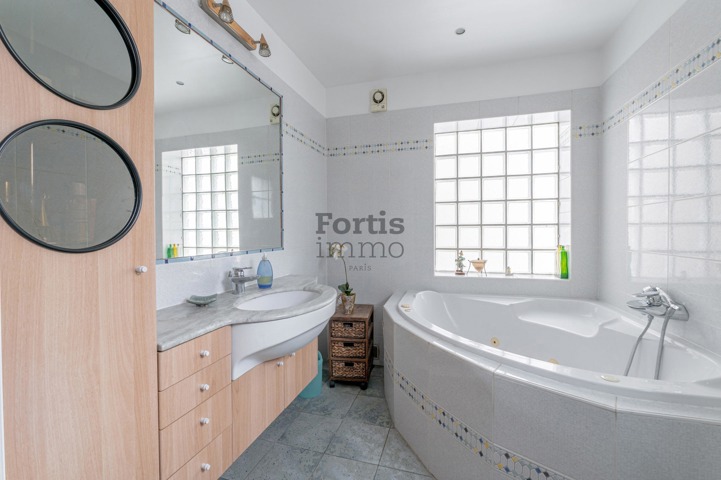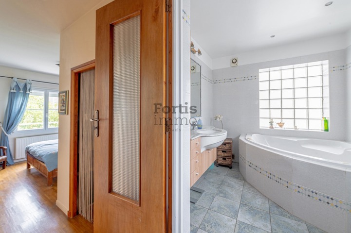 • d’un côté, une chambre parentale équipée d’un dressing, d’une salle de bain avec baignoire balnéo, douche et des WC séparées
