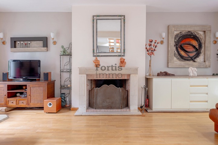 Le cœur de la maison s’organise autour d’un séjour de 48 m² aux allures cathédrales, véritable signature du lieu, où l’espace et la verticalité dialoguent harmonieusement. Une cheminée contemporaine sublime cet espace.