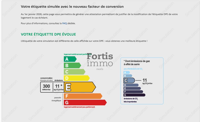 Performance énergétique : E (300 kWh/m². an), dont Emission de gaz à effet de serre C (11 kg/m². an).