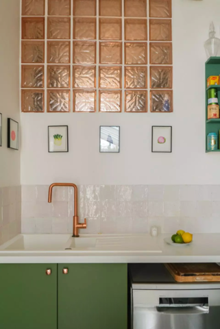 Au fond, le cube comportant la partie nuit se découvre derrière des pavés de verre et se prolonge par une terrasse d’environ 10 m², suivie elle-même par un jardin partagé de 150 m².
