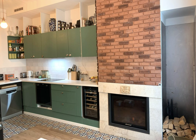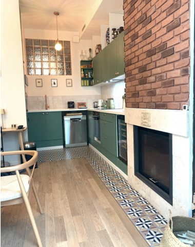 Avec son mélange d’ambiances, l’appartement profite d’une atmosphère douce. La partie cuisine / salle à manger est réchauffée par un mur de briques et une cheminée à insert. Deux arches majestueuses mènent ensuite au salon construit sous la verrière. La belle hauteur sous plafond d’environ trois mètres apporte une véritable virtuosité au lieu.