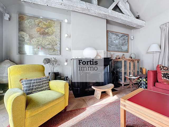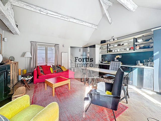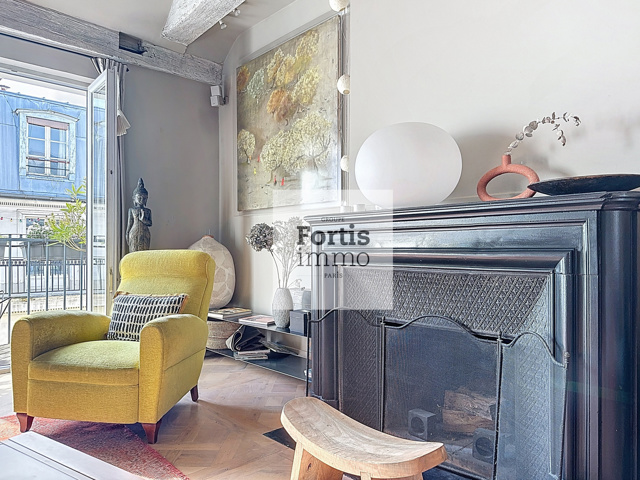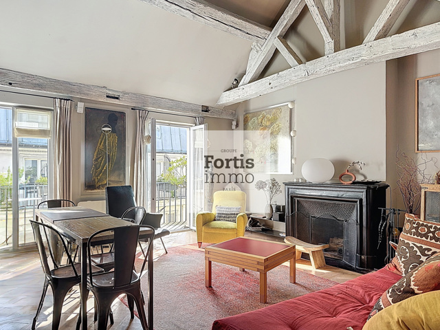 Dans une rue piétonne du centre historique de Paris, au quatrième et dernier étage d’un immeuble de caractère datant de 1830, ce duplex d’exception développe une surface de 68,15 m² loi Carrez pour une surface totale au sol de 75M², ce qui nous permet de retenir une surface intérieure pondérée d’environ 70M².