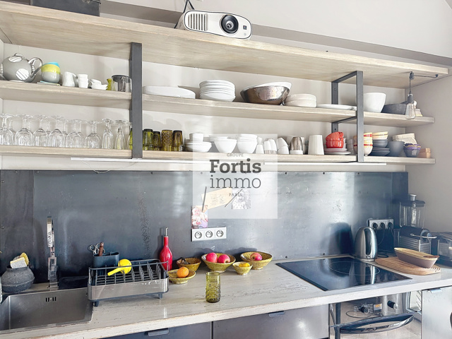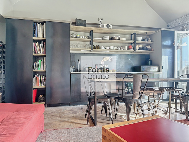Dès l’entrée, accessible par un escalier privatif, le ton est donné : un espace palier instimiste mène à une spectaculaire pièce de vie sublimée par une hauteur sous plafond de 4,50 mètres.