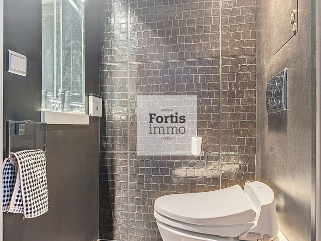 La cuisine, entièrement aménagée et équipée, s’ouvre harmonieusement sur le séjour et se prolonge par un balcon offrant une vue ouverte sur la Canopée et la Tour Eiffel, véritable tableau vivant au fil des heures.