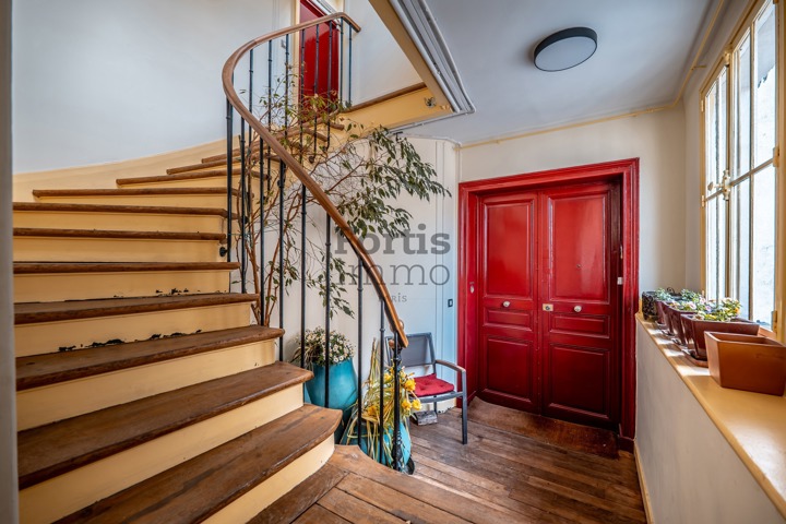 Situé au 4e étage par escalier d’un immeuble historique aux parties communes soigneusement entretenues, cet appartement de 88,61 m2 Carrez se compose comme suit :