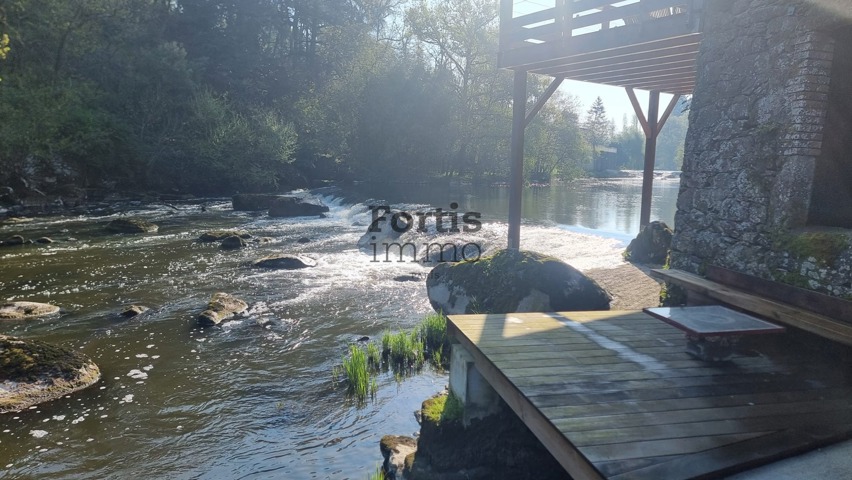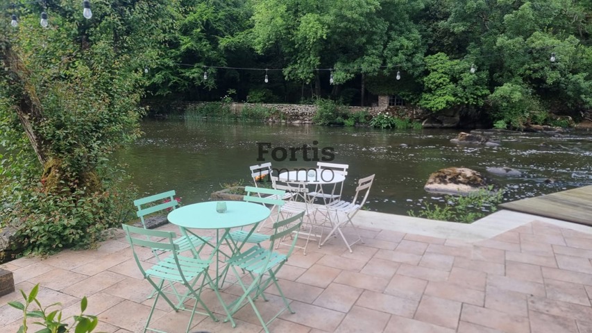 3) À l’extérieur : un jardin avec terrasse (26 m²) au bord de la rivière, et quatre places de parking.