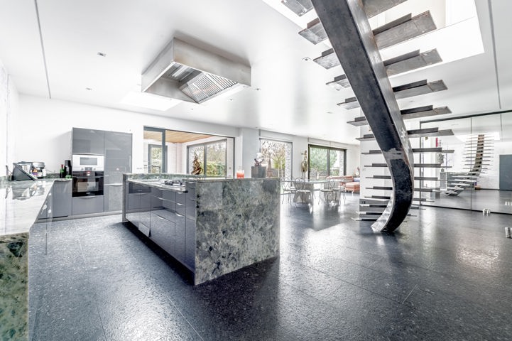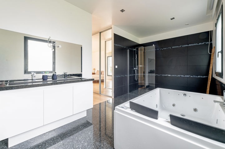En impasse, maison « d’architecte » de 325m2, qui vous propose sur 2 niveaux: une spacieuse pièce de vie de 99m2 avec placard/dressing sur-mesure, et sa cuisine aménagée et équipée en labradorite (granite avec reflets et en pierres pour bijoux), une pièce de 67m2 abritant une piscine intérieure, au sel, chauffée (4X6m avec extraction d’air traitée, chauffée déshumidifiée, et rejetée en soufflerie en air chaud), 5 chambres (1 suite parentale de 50m2 avec salle de bain (douche et jacuzzi 4 personnes) et dressing et 4 autres chambres de 25m2, 21m2, 20m2 et 16m2 toutes équipées de leur placard/dressing), 2 toilettes suspendus séparés dont un avec lave-mains, une salle de bain de 10m2 en granit flammée avec baignoire d’angle jacuzzi, une salle d’eau de 10m2, un dégagement de 25m2 avec de nombreux rangements, et une buanderie de 5m2.