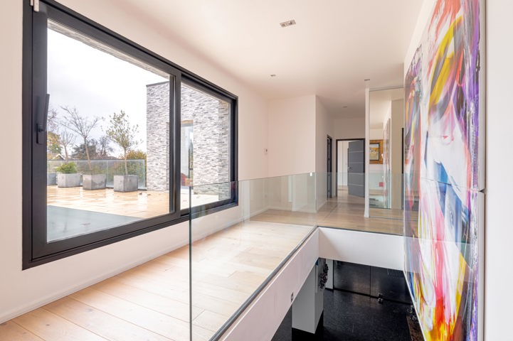 Vous bénéficierez également d’un terrain de 1025m2 parfaitement entretenu et entièrement clôturé avec son jardin paysagé sans vis à vis, d’un vaste garage de 50m2 avec porte motorisée, d’une véritable cave à vin de 35m2, d’un atelier de 30m2, d’une piscine intérieure chauffée, de 200m2 de terrasses dont une en “balcon/terrasse”, et de prestations soignées, de qualité, haut de gamme, et exceptionnelles (planchers chauffants, granite, quartz, labradorite (pierres), plafonds en “staff”, ouvrants en aluminium, en verre anti effraction triple vitrage, très grandes baies vitrées, stores opaques intérieurs, cave avec plafond en verre résistant, belle hauteur sous plafond de 2m80, visiophone, fibre optique, briquettes de parement, alarme, caméras de surveillance, sols en granite, éclairages extérieurs, escalier sur mesure en acier, puits de lumière, parquet massif, salles de bain et salles d’eau et vasques en granite, portes, verres traités thermiquement, toutes les chambres donnent accès à la terrasse surélevée, onyx éclairé, pierres, éclairage autonome, etc…).